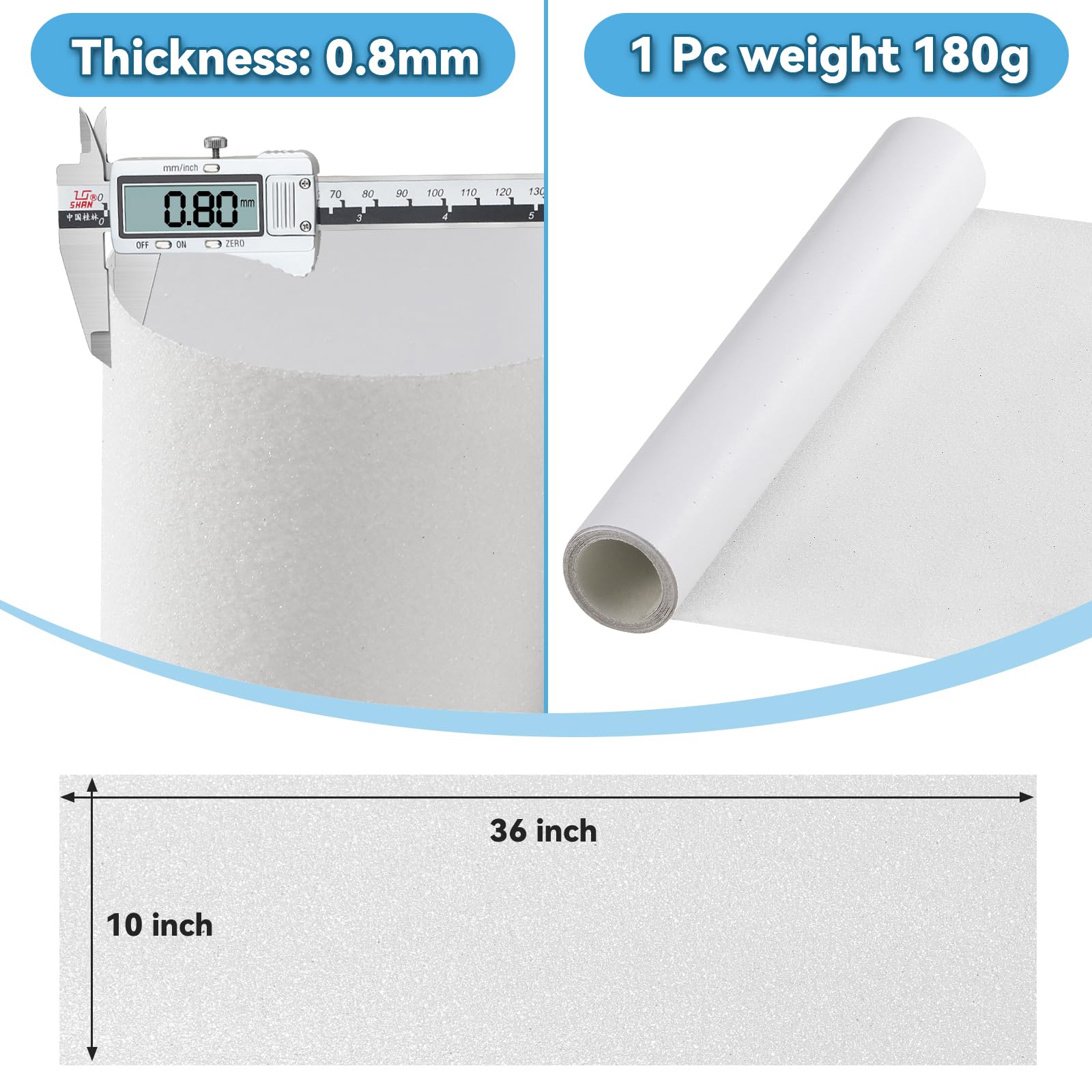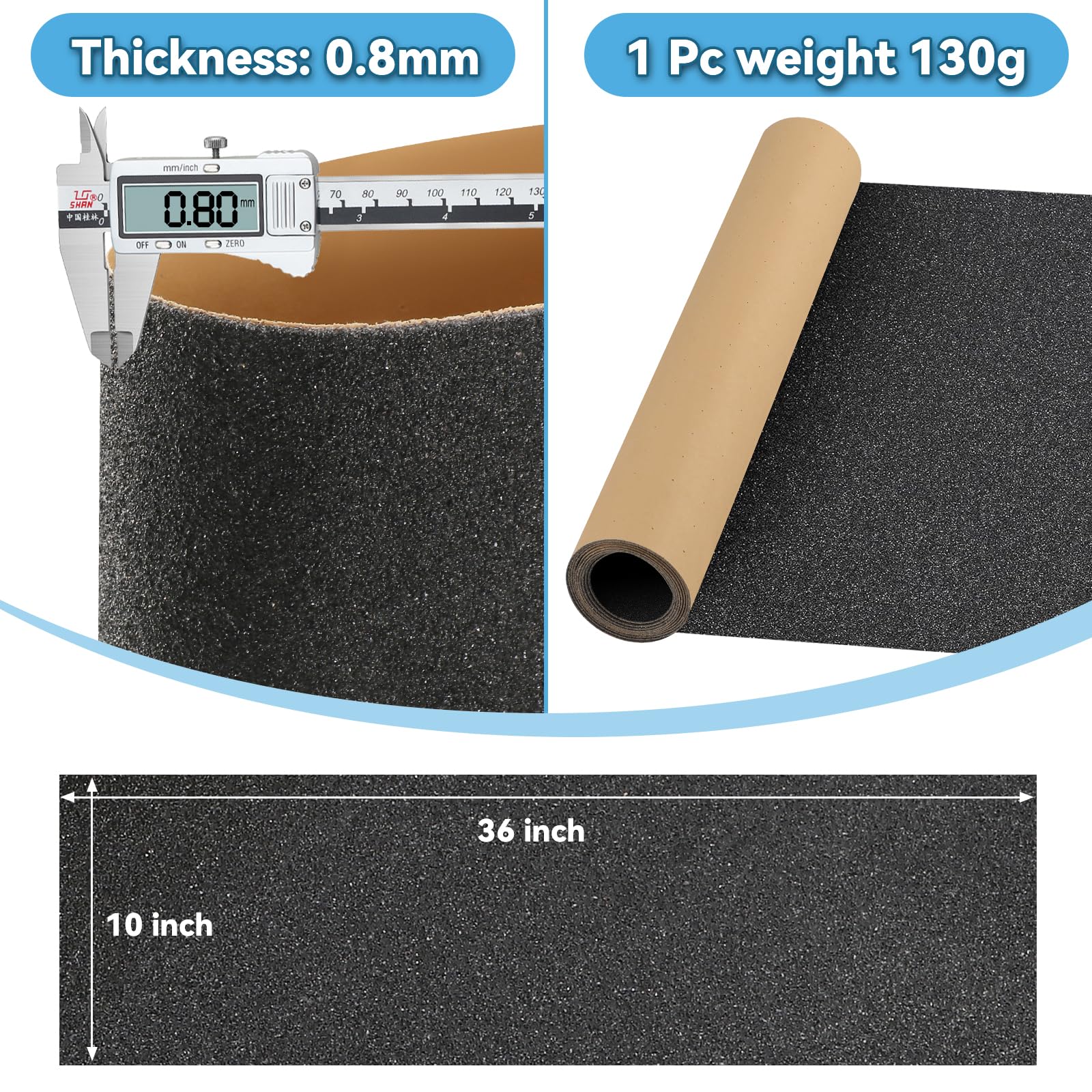 - - The sandpaper has a thickness of 0.8mm and measures 33 inches (84 cm) x 9 inches (23 cm), weighing 130 grams per roll, suitable for various skateboards.